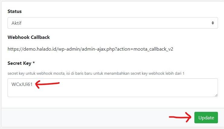 - paste secret key yang di copy sebelumnya dari moota ke kolom secret key