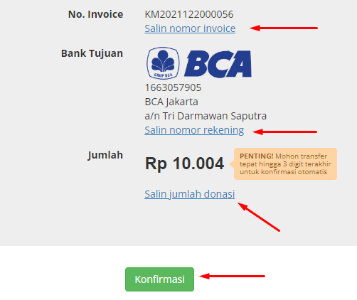 Silakan Transfer sesuai kode unik. Untuk memudahkan transfer Kamu bisa klik Salin Nomer Rekening atau Salin Nominal Donasi.