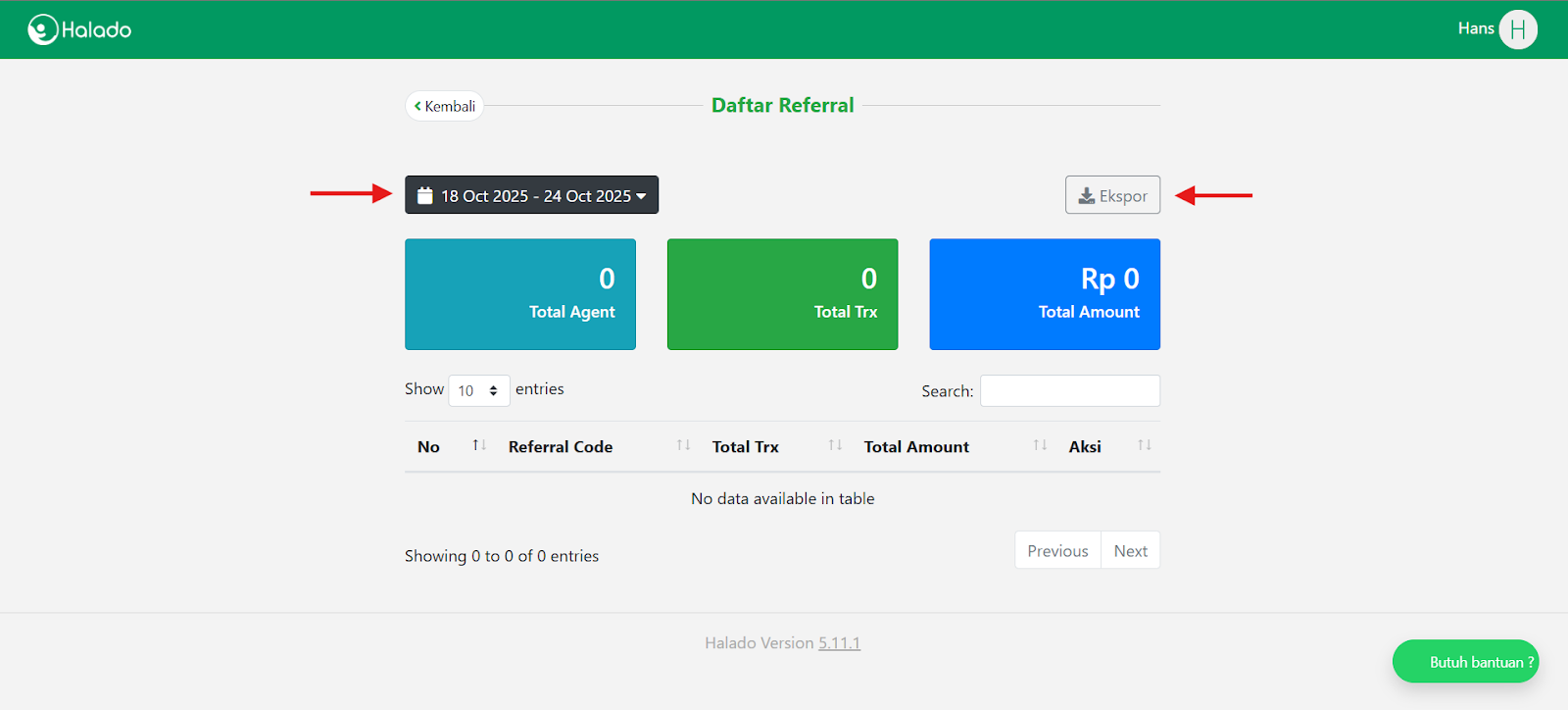 Daftar Referral 30 October 2025 Klik Daftar Referral pada halaman Dashboard Admin Maka akan tampil Daftar Referral yang sudah ada Daftar Referral juga bisa dilihat berdasarkan tanggal yang dipilih dan juga bisa di Ekspor datanya Share: