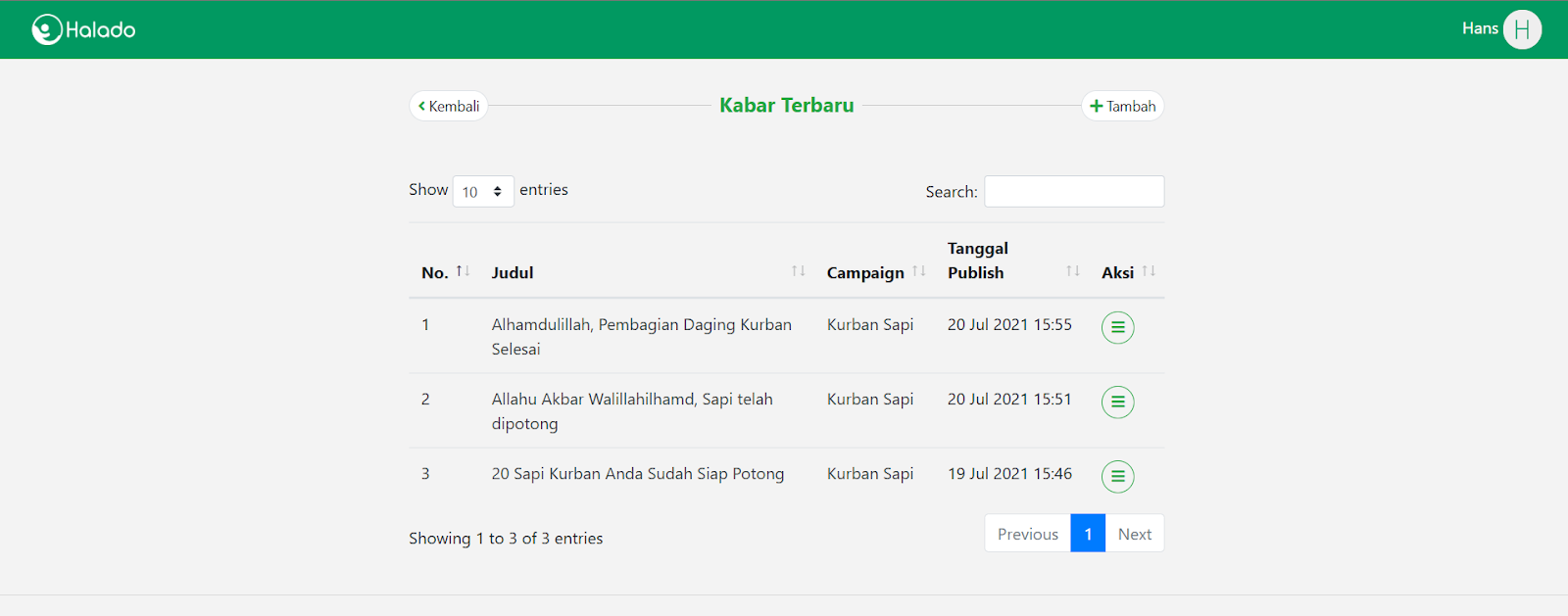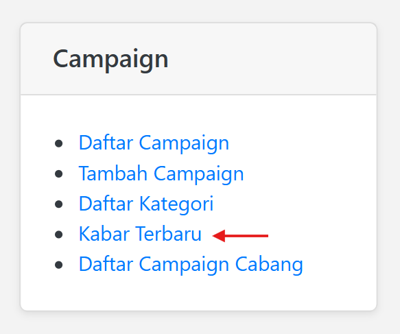Kabar Terbaru 30 October 2025 Klik Daftar Campaign pada halaman Dashboard Admin Maka akan tampil semua Daftar Kabar Terbaru Campaign yang sudah dibuat (Pada halaman Daftar Kabar Terbaru Campaign juga bisa menambah kabar terbaru untuk campaign) Share: