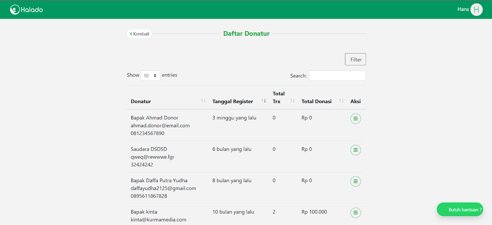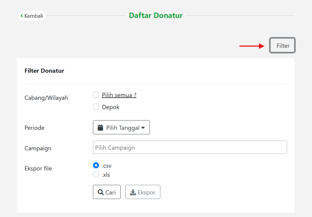 - Daftar Donatur bisa dicari menggunakan fitur Filter untuk memudahkan pencarian Daftar Donatur