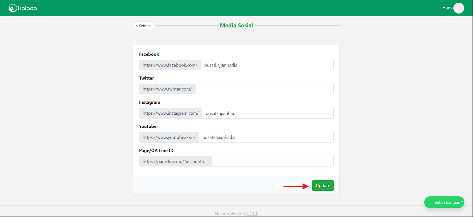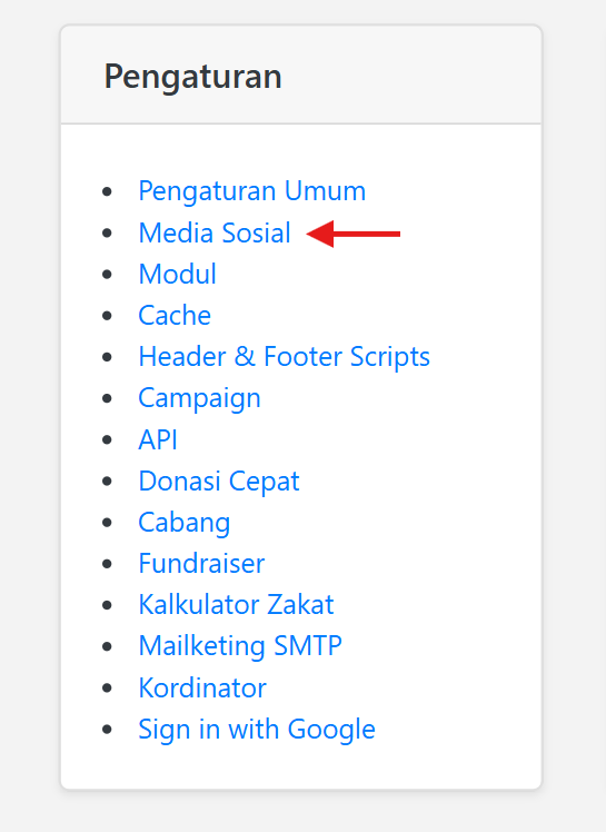 - Klik Pengaturan Media Sosial pada halaman Dashboard Admin