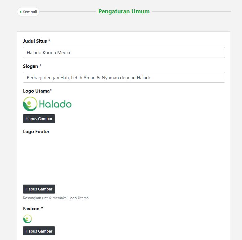 - Pada halaman pengaturan umum, kamu bisa mengisi semua kolomnya untuk keperluan tampilan di web situs kamu