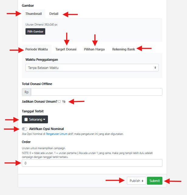 - Memilih opsi “Jadikan Donasi Umum?“ jika dipilih maka di ceklis jika tidak maka tidak perlu di ceklis