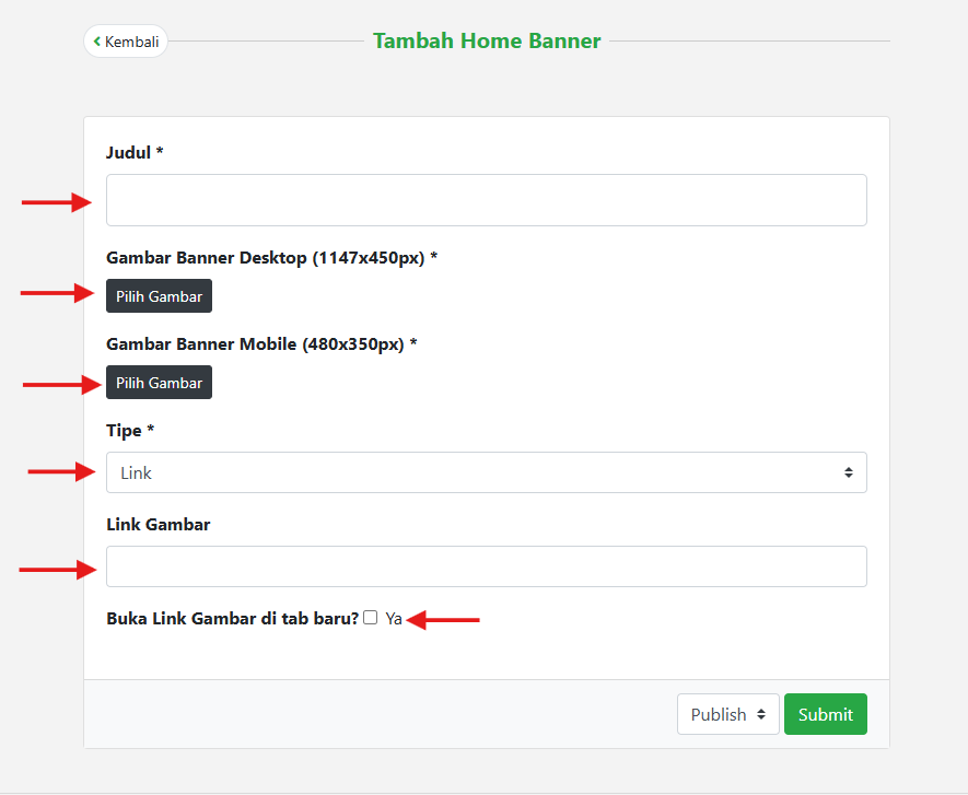 - Pada halaman Daftar Home Banner Klik Menu “Tambah”