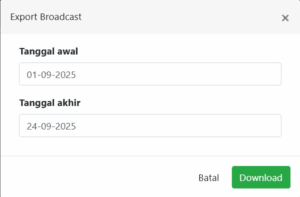 • Jika pengguna ingin melihat laporan broadcast dari 01-09-2025 hingga 24-09-2025, maka masukkan tanggal tersebut di kolom Tanggal awal dan Tanggal akhir, lalu klik Download.
