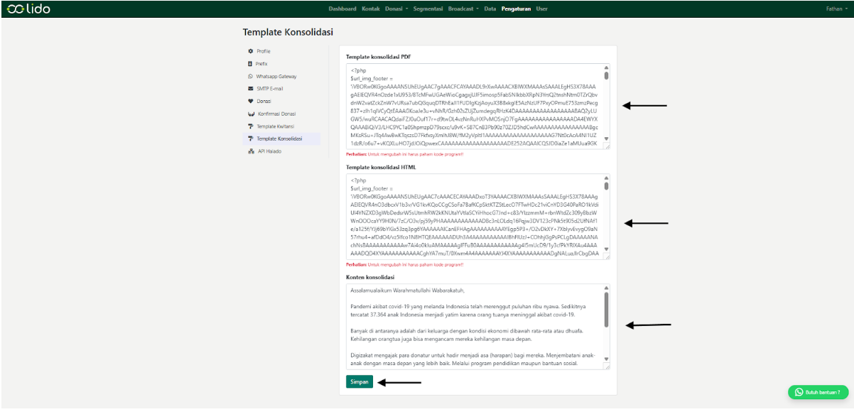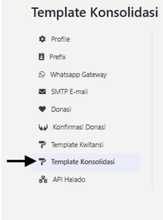 Menu Template Konsolidasi digunakan untuk mengatur tampilan bukti atau laporan konsolidasi donasi, baik dalam bentuk PDF maupun HTML, serta mengisi konten narasi yang akan muncul di dokumen konsolidasi.