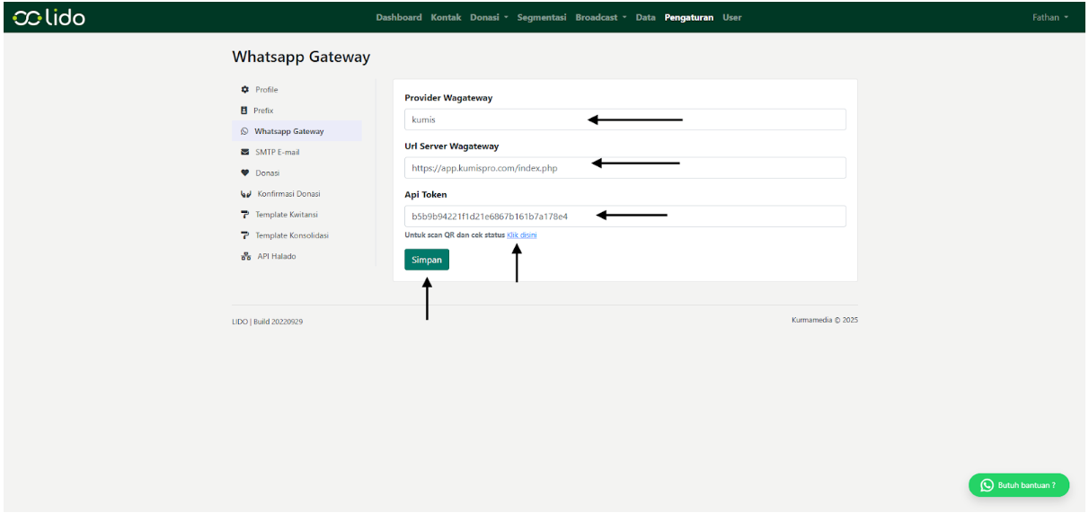 API Token Kode autentikasi agar LIDO bisa terhubung dengan layanan WA Gateway