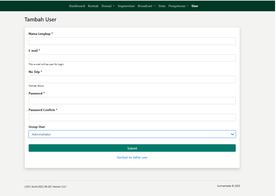 Fitur Tambah User digunakan untuk membuat akun baru untuk orang yang akan mengelola CRM, seperti admin kampanye, admin donasi, atau CS.