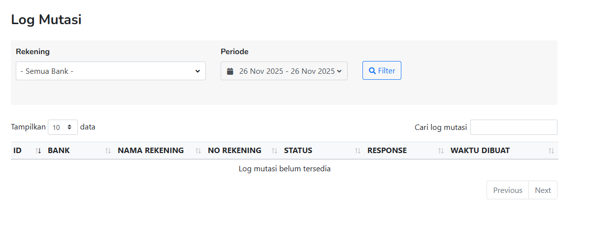 Halaman Log Mutasi menampilkan seluruh catatan proses pengambilan mutasi rekening dari bank. Log ini digunakan untuk memastikan bahwa sistem berhasil mengambil mutasi dari setiap akun yang terhubung.
