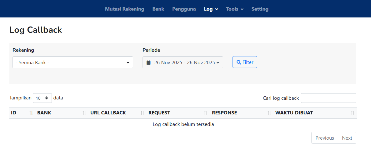 Log ini menyimpan catatan pengiriman data mutasi ke URL callback yang telah ditentukan pada pengaturan bank (misalnya untuk sistem pembayaran atau aplikasi internal).