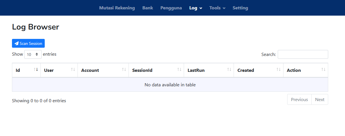 Log Browser mencatat aktivitas dari browser automation (misalnya bot Chrome yang login ke internet banking). Biasanya digunakan untuk bank yang membutuhkan otomatisasi lewat browser, bukan API.