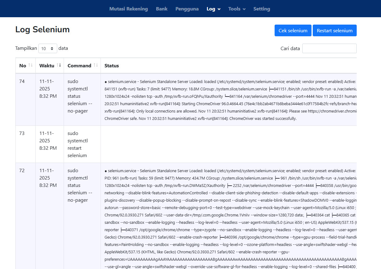 | Command | Perintah sistem yang dijalankan, misalnya: sudo systemctl status selenium –no-pager atau sudo systemctl restart selenium. |