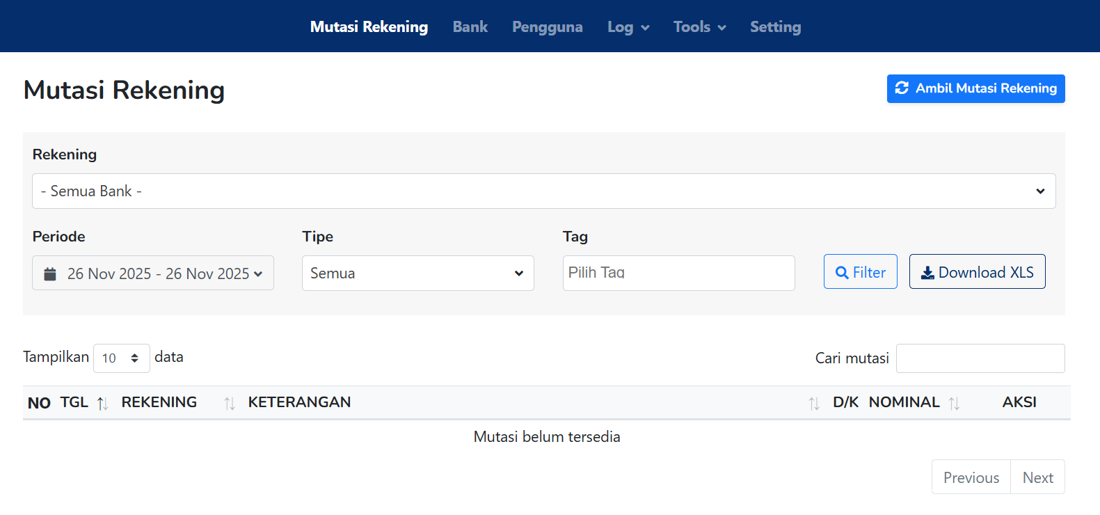 - Opsi “- Semua Bank -” digunakan untuk menampilkan mutasi dari seluruh rekening.